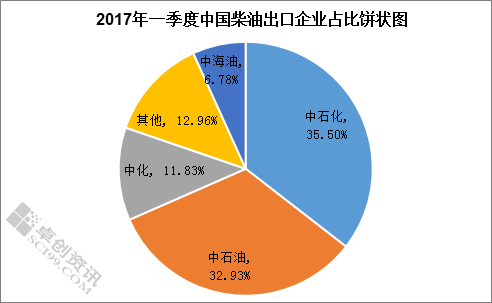 通过图2可以看出,2017年一季度中国柴油出口企业中,四桶油(中石化、中石油、中化、中海油)柴油出口占比高达87.04%,来料加工贸易占比不足九成。据卓创资讯了解,一季度,中石化柴油出口149.12万吨,位居出口第一位且出口占比在35.5%,中石油柴油出口在138.33万吨,中化(包含弘润)超过中海油出口在49.69万吨。