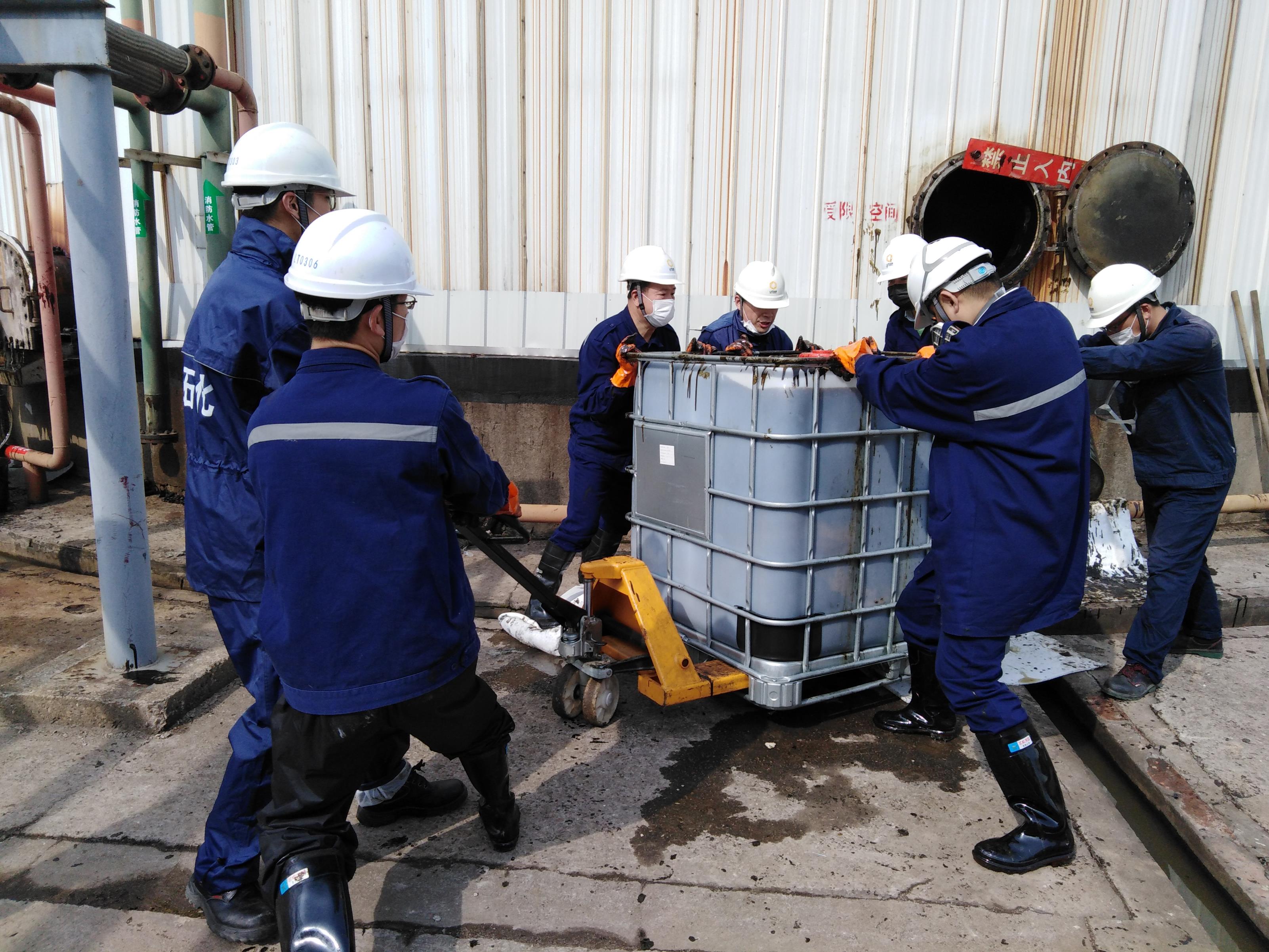 为适应后期业务更换品种,需要对3209罐进行彻底清洗,罐内原存储品种黏稠度很大,给清洗储罐带来了巨大的挑战,必须使用大量的人工清理。劳动过程中,大家不怕脏不怕累,齐心协力将物料残渣一桶一桶地运送出来,别看一个立方桶不大,要把它装满却要经过无数次的重复倒灌。虽然天气寒冷,但是大家干得满身是汗,虽已经精疲力尽,但稍作休息后又全身心投入到劳动中。